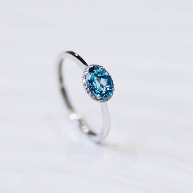 • Bague en or blanc 18cts sertie d’une aigue-marine et de diamants taille brillant.