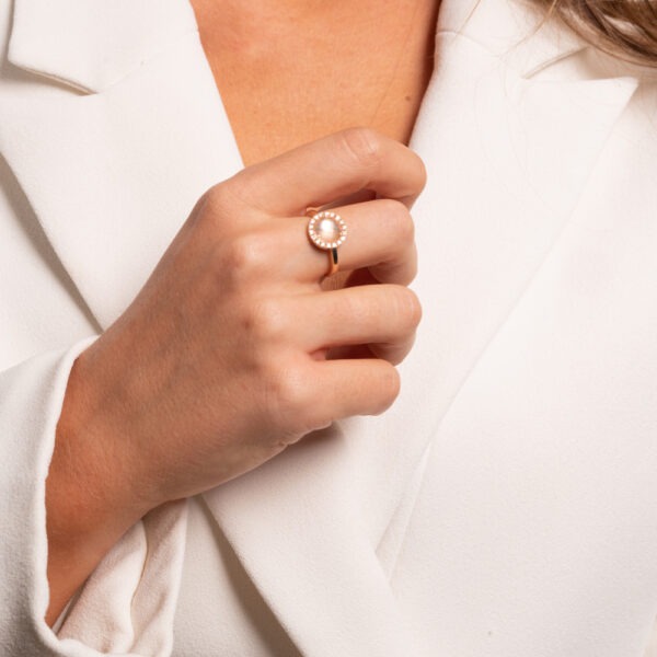 • Bague en or rose 18 carats sertie d’un quartz rose et de diamants taille « brillant »