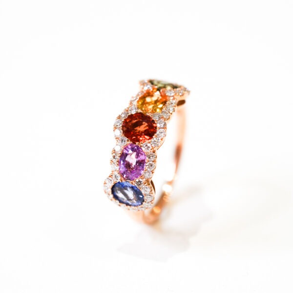 • Bague en or rose 18 carats sertie de saphirs de couleurs et de diamants taille brillant.